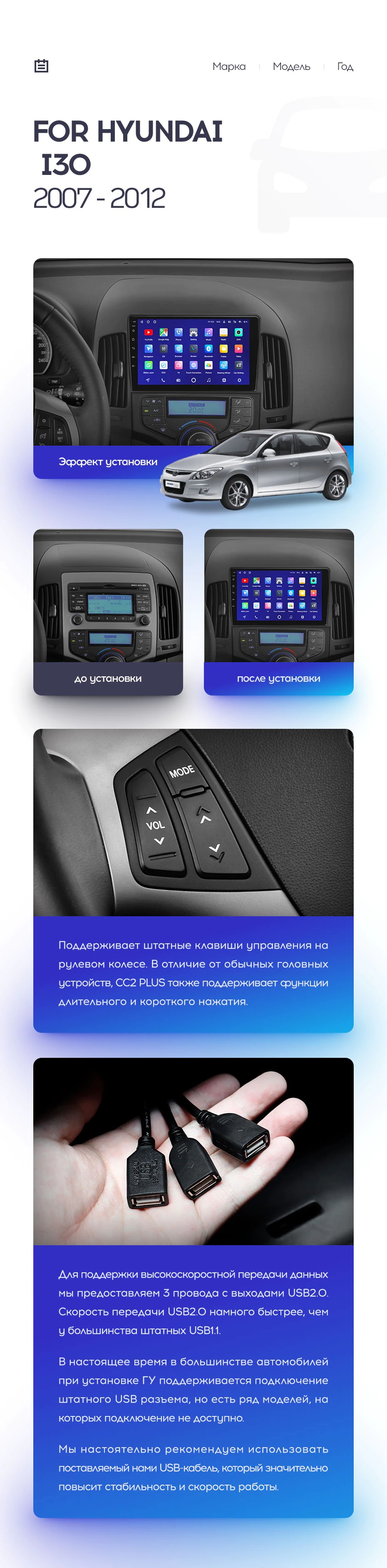 Полный комплект установки магнитолы Teyes с рамкой и проводкой можно выбрать в каталоге штатных магнитол Hyundai i30 1 FD (2007-2012).