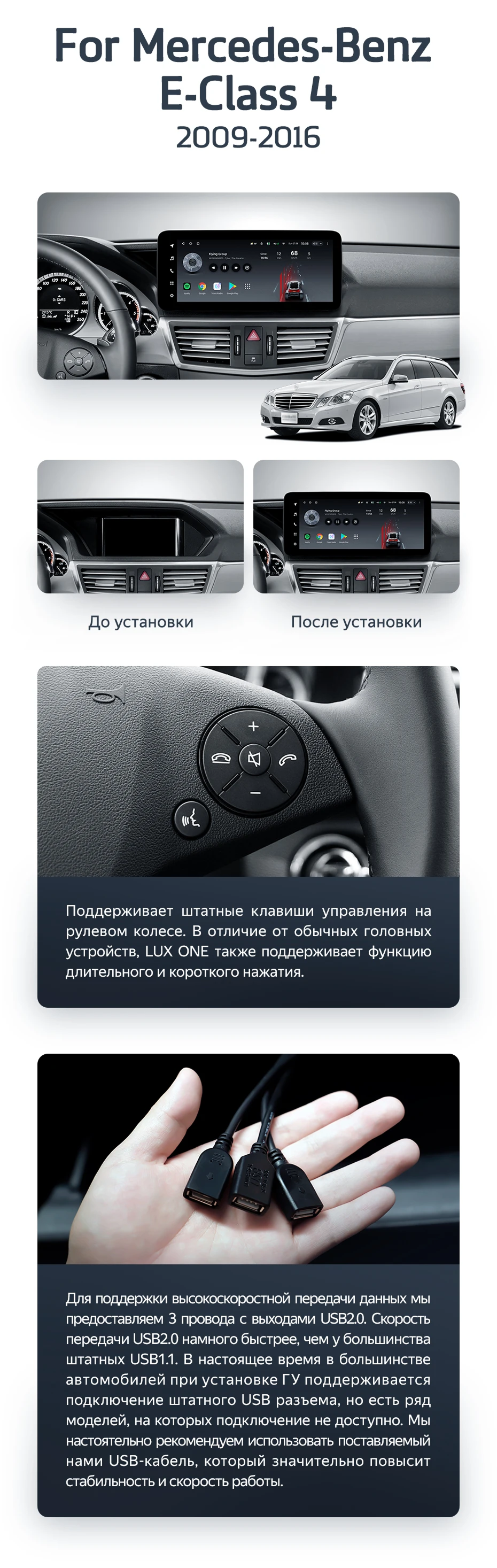 Готовый установочный комплект для магнитолы Mercedes-Benz E-Class 4 W212 S207 A207 S212 C207 (NTG 4.5) (2009-2016) Правый руль 12,3 дюйма в штатное место, включает переходную рамку и проводку.
