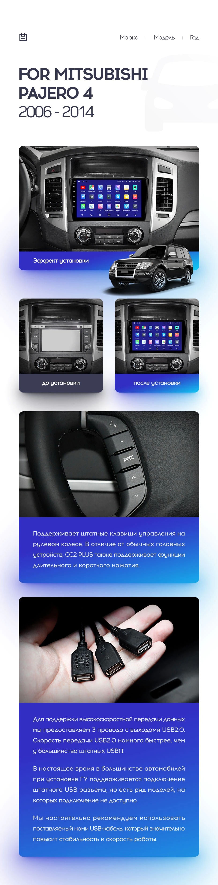 Установочный комплект для Mitsubishi Pajero 4 V80 V90 (2006-2022) включает переходную рамку и проводку.