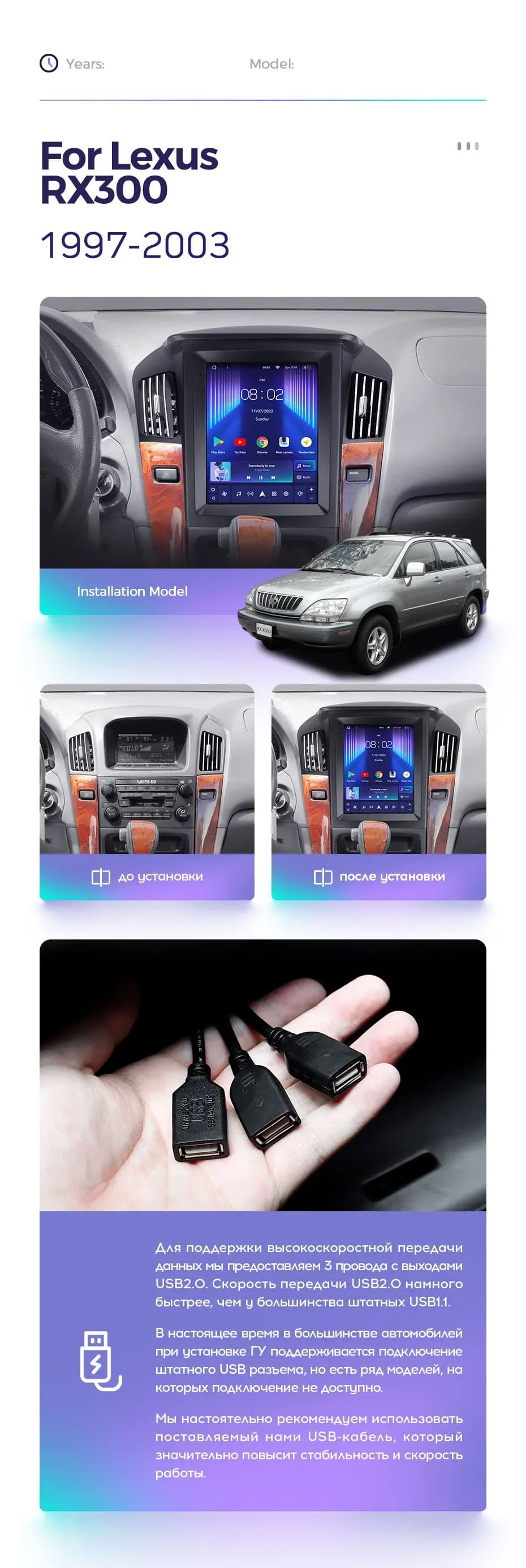 Полный комплект установки магнитолы Teyes с рамкой и проводкой можно выбрать в каталоге штатных магнитол Lexus RX300 XU10 (1997-2003).